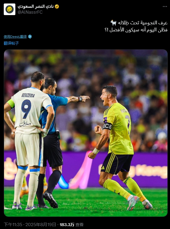 赛后,利雅得胜利官方账号晒出C罗和本泽马同框照片,并且配文:他在他的阴影下,知道了球星的特质。所以他今天认为自己是最好的?
